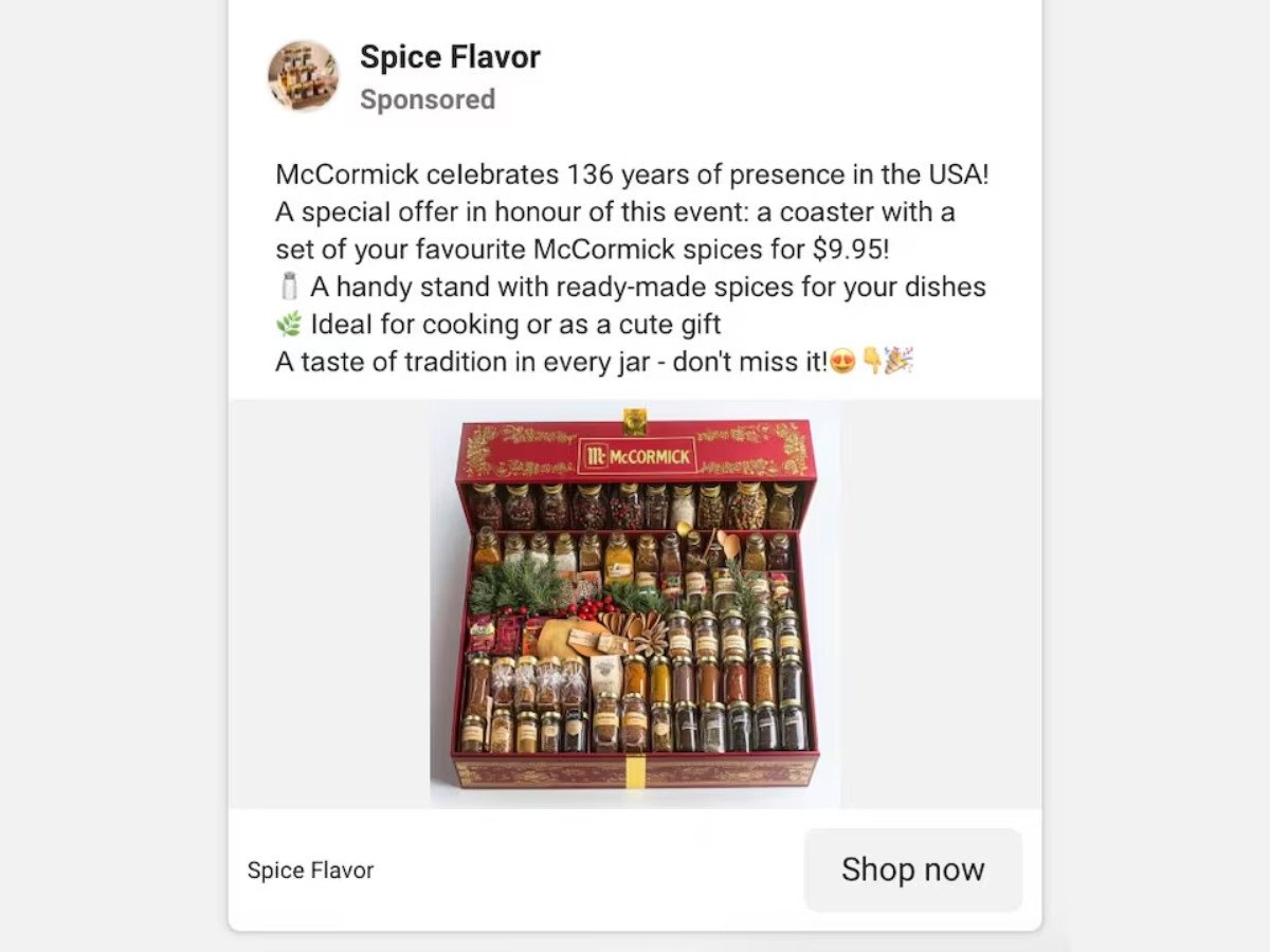 Meta estimates that it shows its users 15 billion scam ads a day. These screenshots show false ads Meta removed from Facebook after Reuters flagged them. Spice maker McCormick confirmed the ad in its name was fake. Elon Musk, the White House and law firm Hogan Lovells had no comment. Screenshot via REUTERS