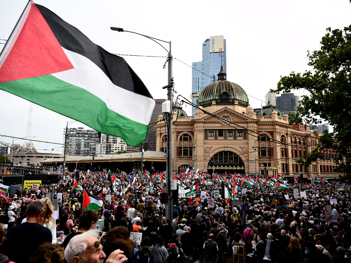 In Sydney, thousands gathered in a square in the city’s central business district, listening to speeches and shouting pro-Palestine slogans.