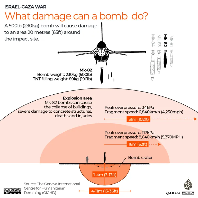 - BLU-109 bunker buster: Used in an attack on al-Mawasi, an area Israel had declared a “safe zone” for forcibly displaced Palestinians in September 2024, this bomb evaporated 22 people. It has a steel casing and a delayed fuse, burying itself before detonating a PBXN-109 explosive mix. This creates a large fireball inside enclosed spaces, incinerating everything within reach.