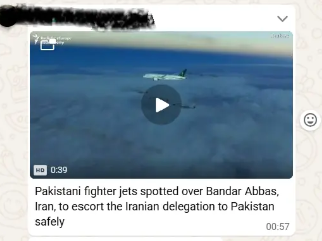 Multiple users, including PML-N supporters, were sharing a video across social media platforms since Thursday, claiming it shows Pakistani fighter jets escorting an Iranian delegation to Islamabad for talks. However, the video is old and shows Pakistani jets greeting the plane of Saudi Arabia’s crown prince during his visit on February 17, 2019.
