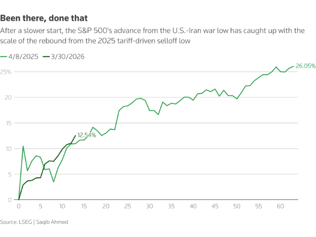 After a slower start, the S&P 500’s advance from the US-Iran war low has caught up with the scale of the rebound from the 2025 tariff-driven selloff low