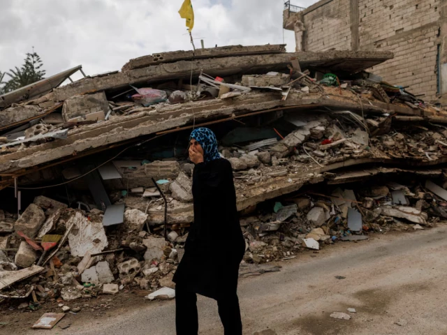 A resident walks while covering her nose to protect against the smell rising from a building containing homes and a restaurant hit by an Israeli strike hours before the ceasefire, amid a 10-day ceasefire between Lebanon and Israel, in Zrarieh, Lebanon, April 19, 2026. PHOTO: REUTERS