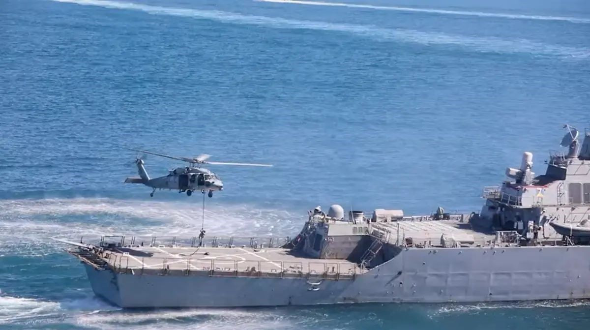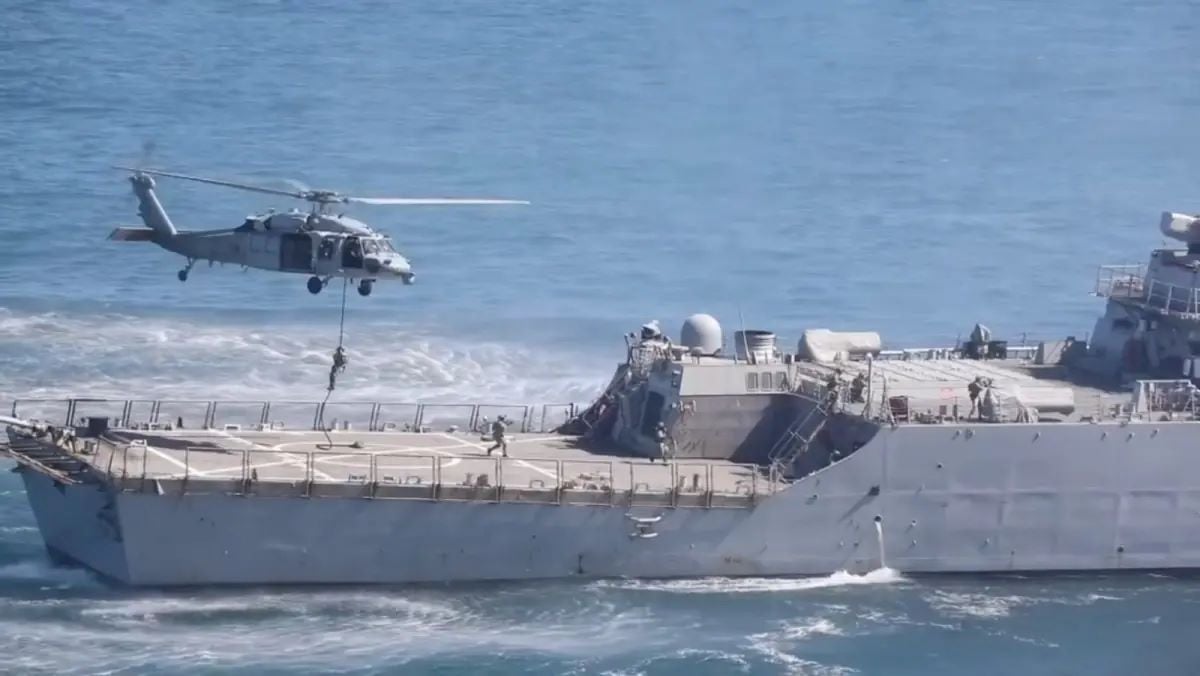 Multiple users across social media platforms were sharing a video since April 20, 2026, claiming it shows the American military seizing an Iranian commercial ship amid a US naval blockade in the Strait of Hormuz. However, the footage is from October 2025 and shows a US naval exercise.