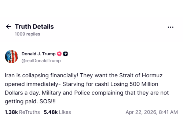 In a separate Truth Social post, Trump has claimed that Iran is “collapsing financially” and “wants the Strait of Hormuz open immediately” as they are “starving for cash!” He has also claimed that the military and the police are “complaining that they are not being paid.”