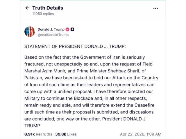 Trump extends ceasefire at Pakistan’s request until Iran submits ‘unified proposal’